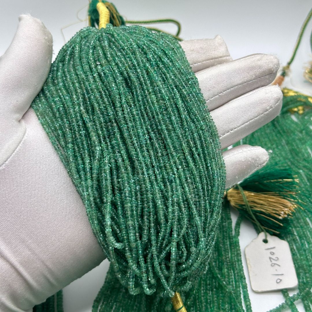Elevate your jewelry creations with our Natural Emerald Smooth Rondelle Beads, sized from 2mm to 3mm. These petite AAA+ quality emerald beads feature a smooth, polished finish with vivid green hues, perfect for delicate and intricate designs.
